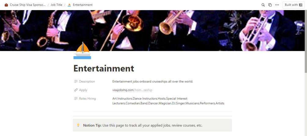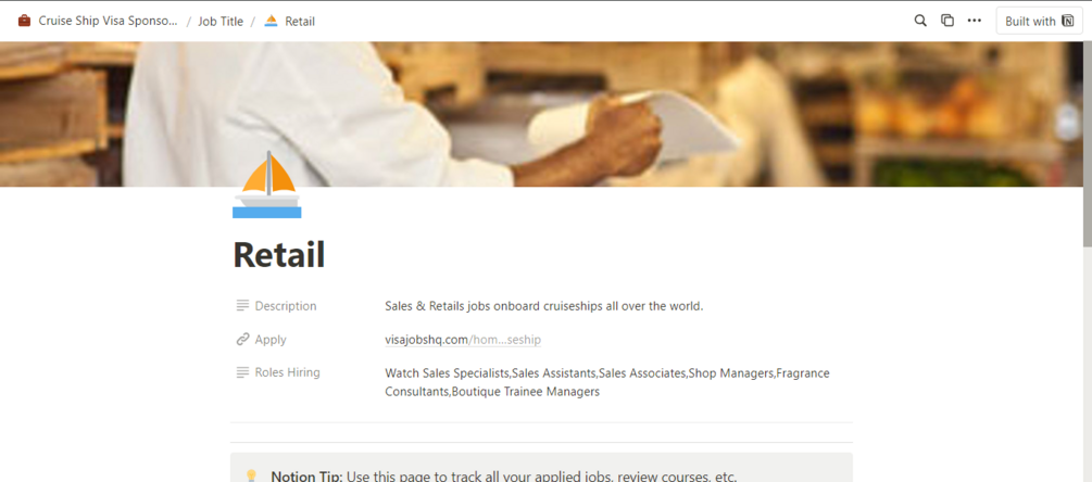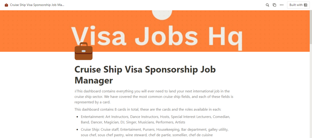 For cruise ship roles, this is the use case: if you're a Cruise Staff, Entertainer, Purser, Sous Chef, Sommelier, etc in Nigeria, Ghana, Bangladesh, India, Pakistan, or any other country in the world seeking your next adventure abroad, our Cruise Ship Tracker is your go-to. Inside, discover top International Hospitality Recruiters across the UK, Canada, Europe, the Middle East, and beyond. Utilize our cold email templates to reach out effectively, while upgrading your CV with our customizable templates. Track your communications seamlessly, noting responses and stages, all within the tracker. Prepare for interviews with our expert tips, ensuring you're ready with relevant answers. Submit your CV to top Cruise lines hiring professionals like yourself, all through our comprehensive tracker.